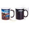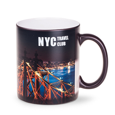 An advertising mug in a popular, cylindrical shape and matt surface. The model is dedicated to the application of the Magic Mug print - the designs only appear when warm. The matt external surface is serves to "hide" the print when the mug is cold.