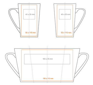 Print on the handle (60x10 mm) Print on the inside (50x10 mm) Print on the bottom outside (ø40 mm) Gold print Silver print Over the rim imprint Hand Made - rim painting Personal print |
