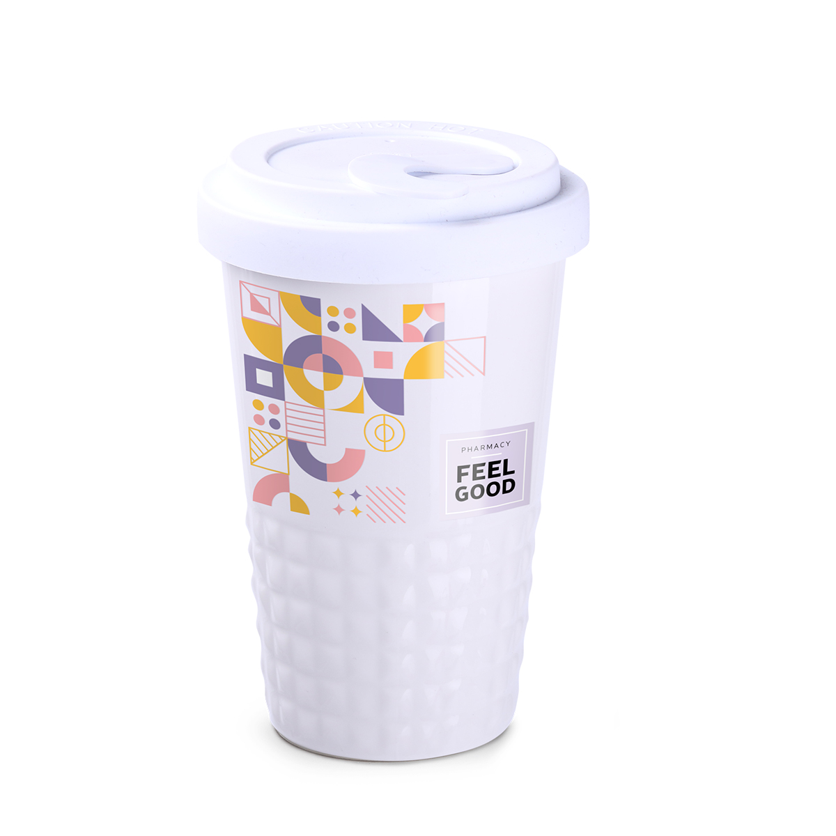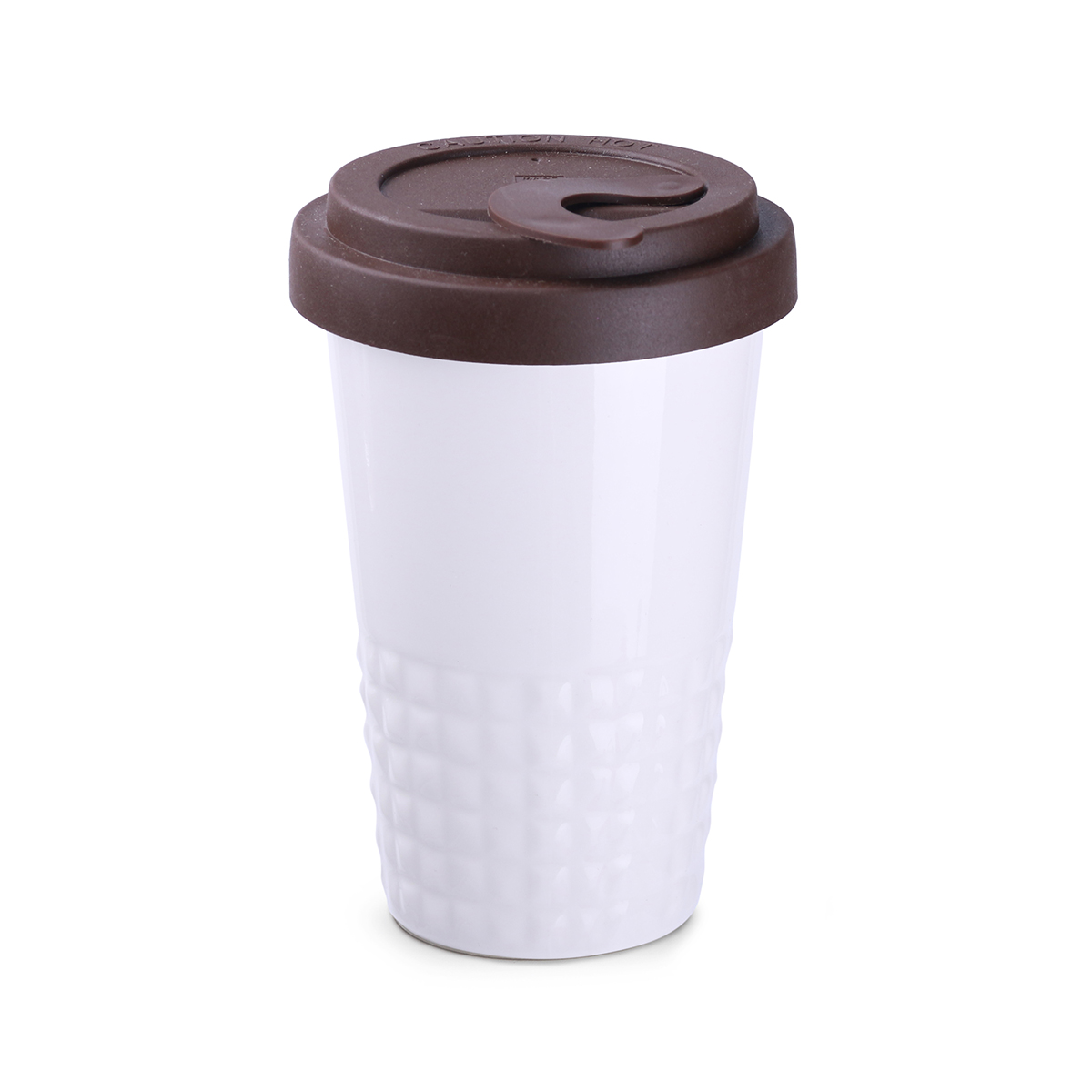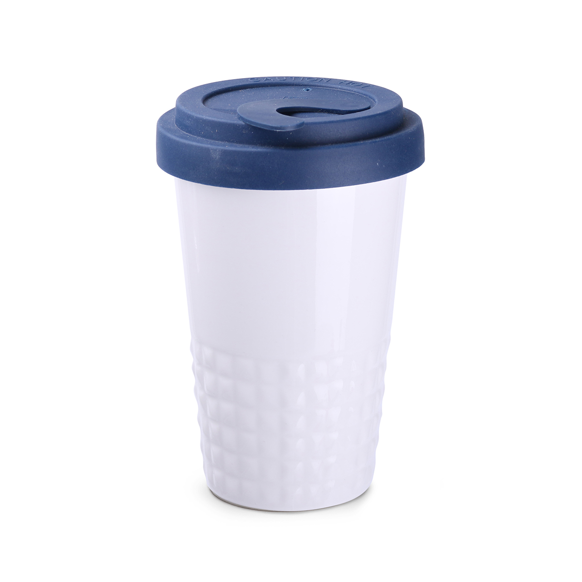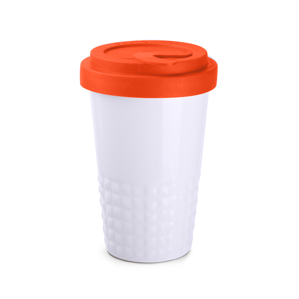 A new addition to the promotional ceramics market. Subtle finishing of the lower part of the mug in the form of symmetrical protrusions. Double-walled porcelain mug providing excellent thermal insulation. Exceptionally tight lid. Model designed for active users. The lid is available in the following colors: white, orange 021C, Cool Gray 7, navy blue 294C, brown 4695C, black, pink 4064C, blue 2144C, eucalyptus 5493C, desert sand 2310C.