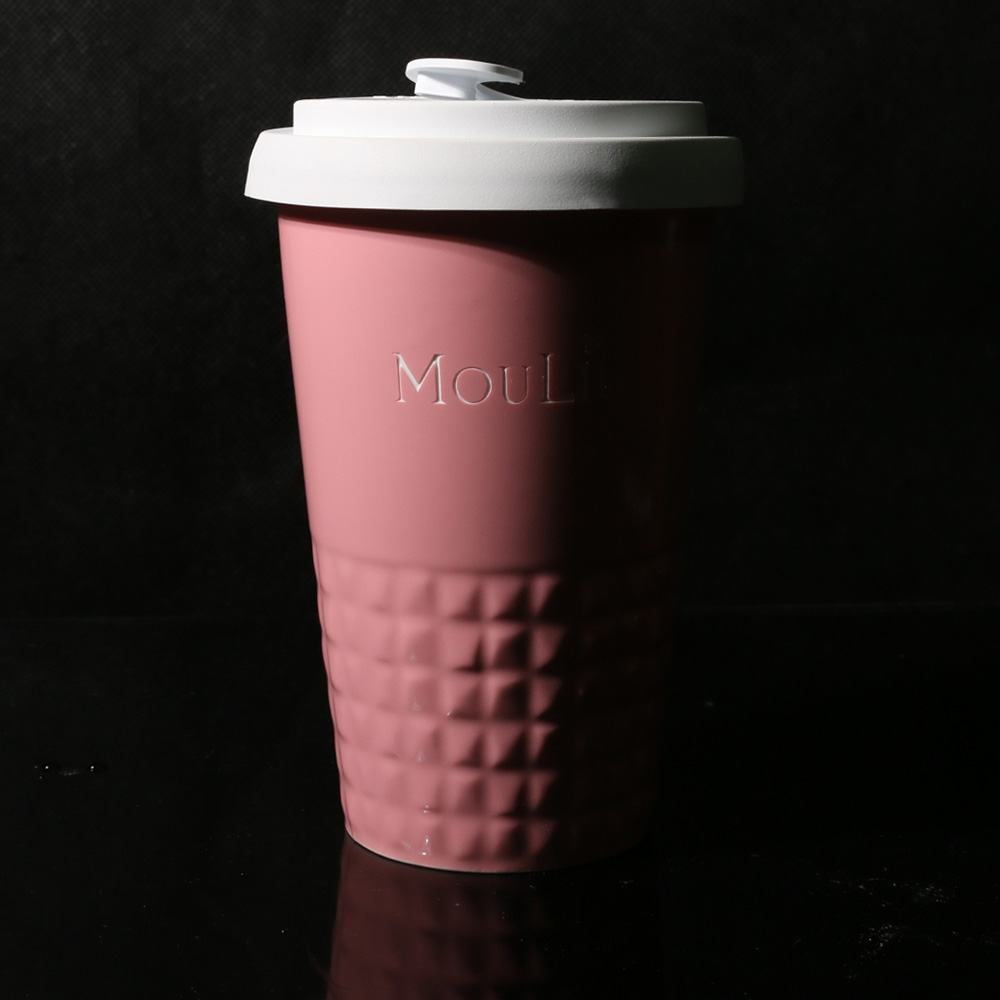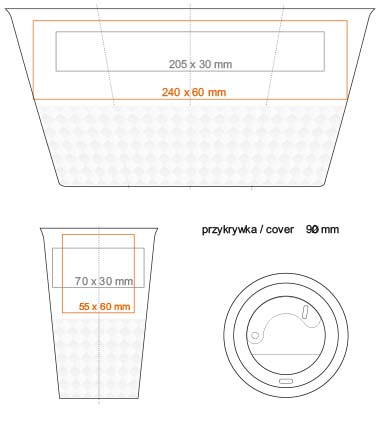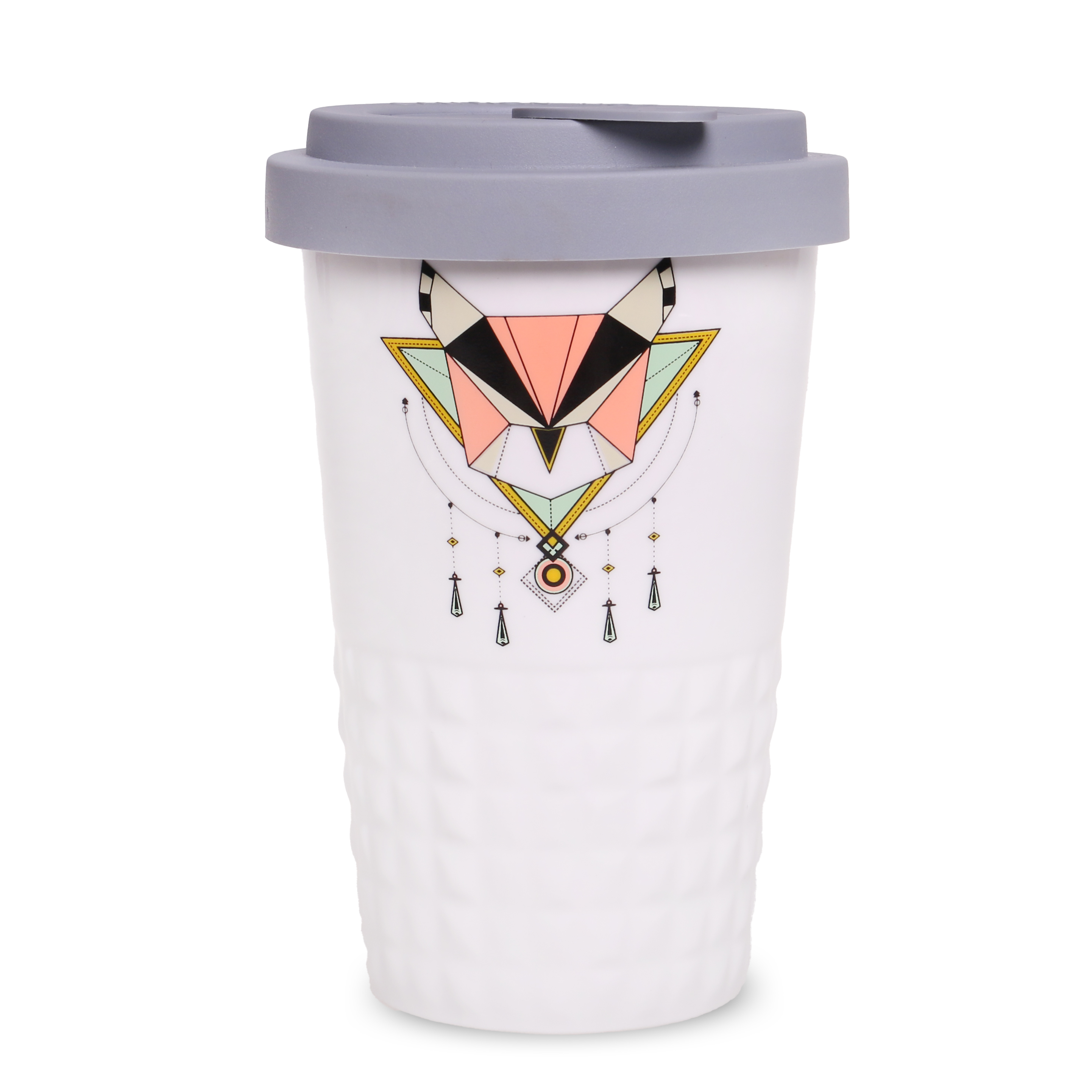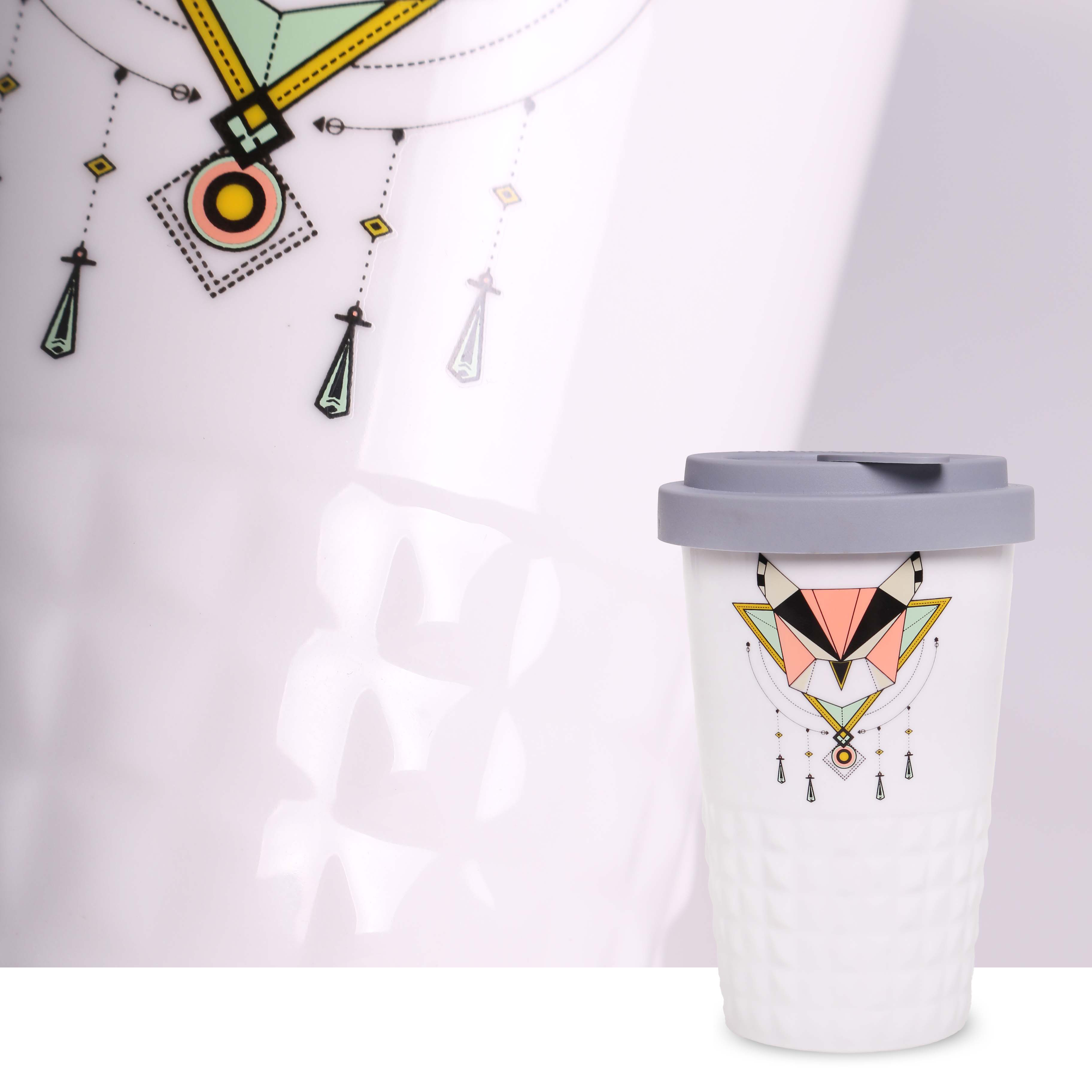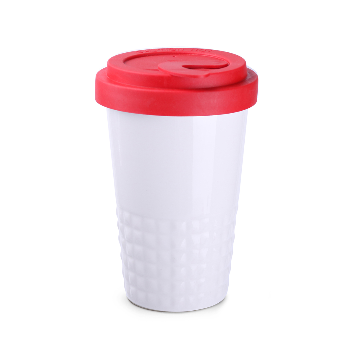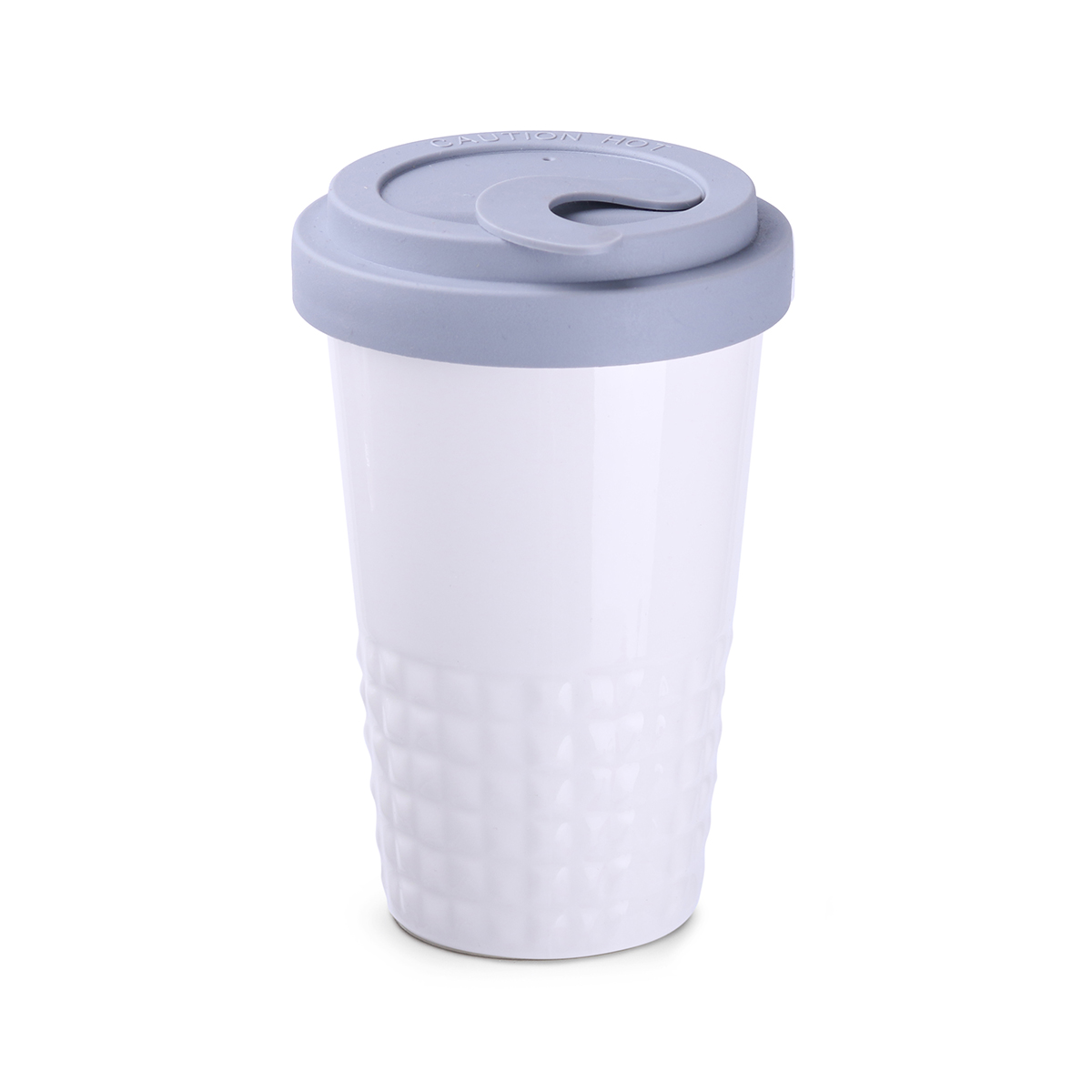 A new addition to the promotional ceramics market. Subtle finishing of the lower part of the mug in the form of symmetrical protrusions. Double-walled porcelain mug providing excellent thermal insulation. Exceptionally tight lid. Model designed for active users. The lid is available in the following colors: white, orange 021C, Cool Gray 7, navy blue 294C, brown 4695C, black, pink 4064C, blue 2144C, eucalyptus 5493C, desert sand 2310C.