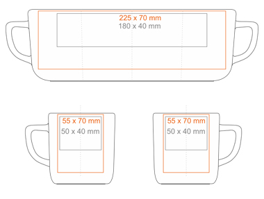 Print on the handle (40x10 mm) Print on the inside (60x15 mm) Print on the bottom inside (ø30 mm) Print on the bottom outside (ø40 mm) Over the rim imprint Personal print Personalisation engraving |