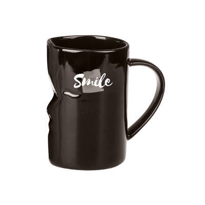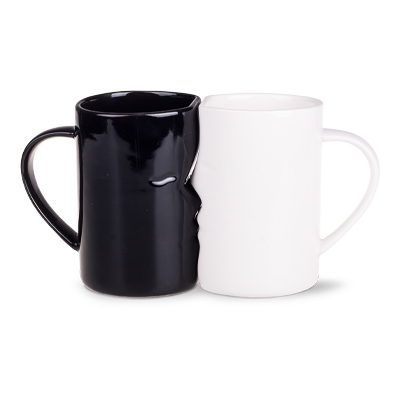 A set of two perfectly matching mugs with edges shaped like a face - the white mug is made of Royal White porcelain, the black mug is made of ceramic. This product is from the end of a series and may have pinholes, dots, and variations in glaze shade.