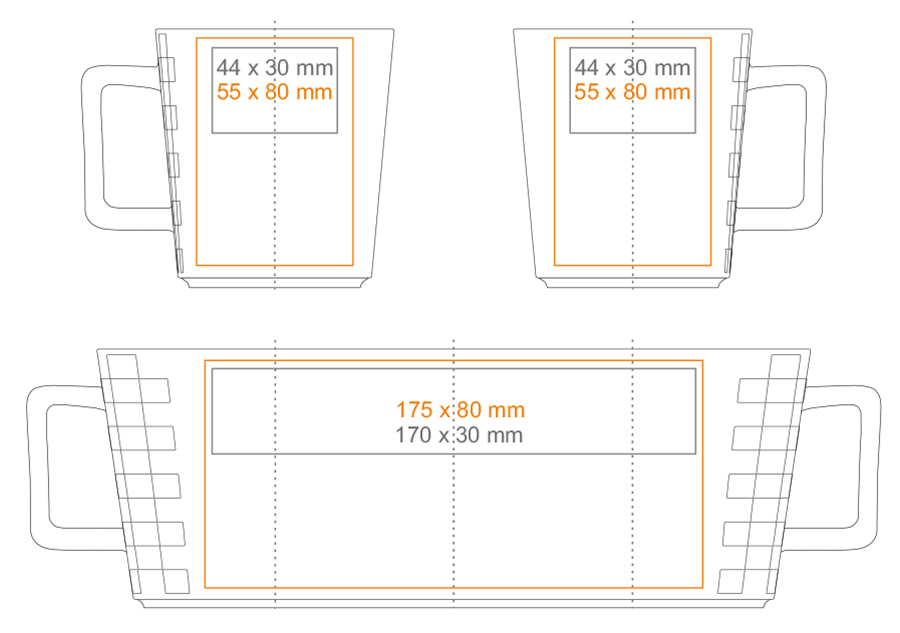 Print on the inside (40x20 mm) Print on the bottom inside (ø35 mm) Print on the bottom outside (ø42 mm) Gold print Silver print Over the rim imprint Hand Made - rim painting Personal print |