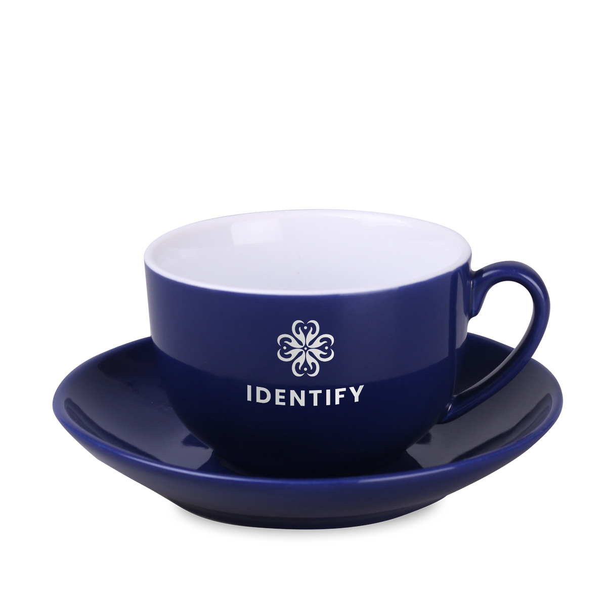 An oval shaped advertising cup with colorful outside glaze and white inside. The design is available in many different color versions.
