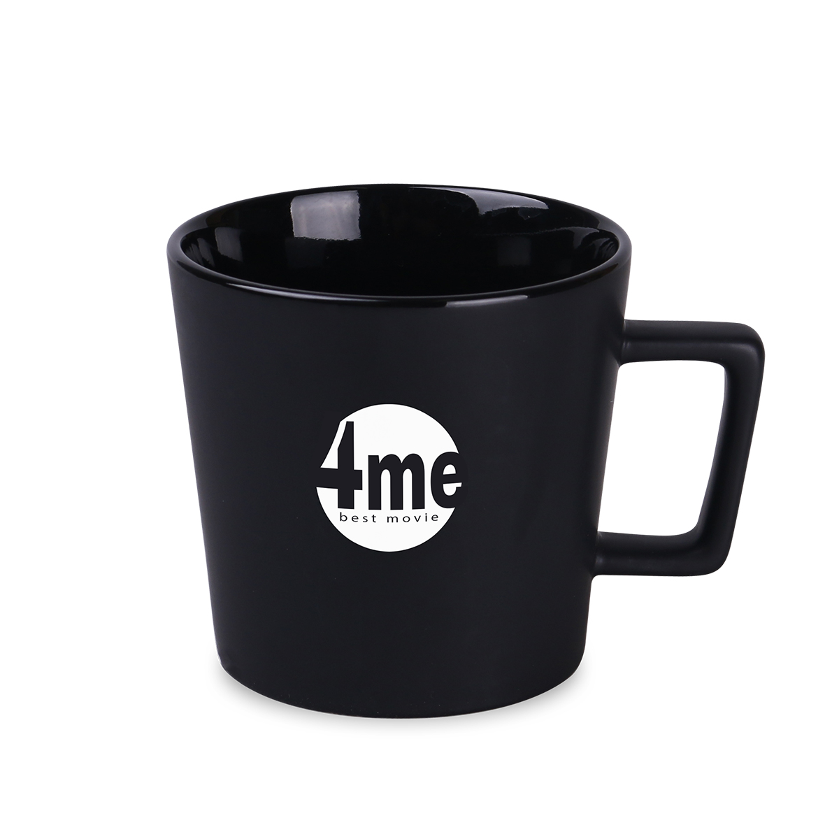 Modern mug with a matte black surface. It features a handle with an interesting, designer shape.