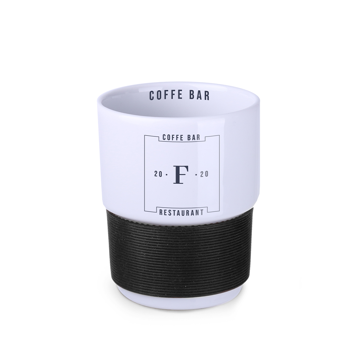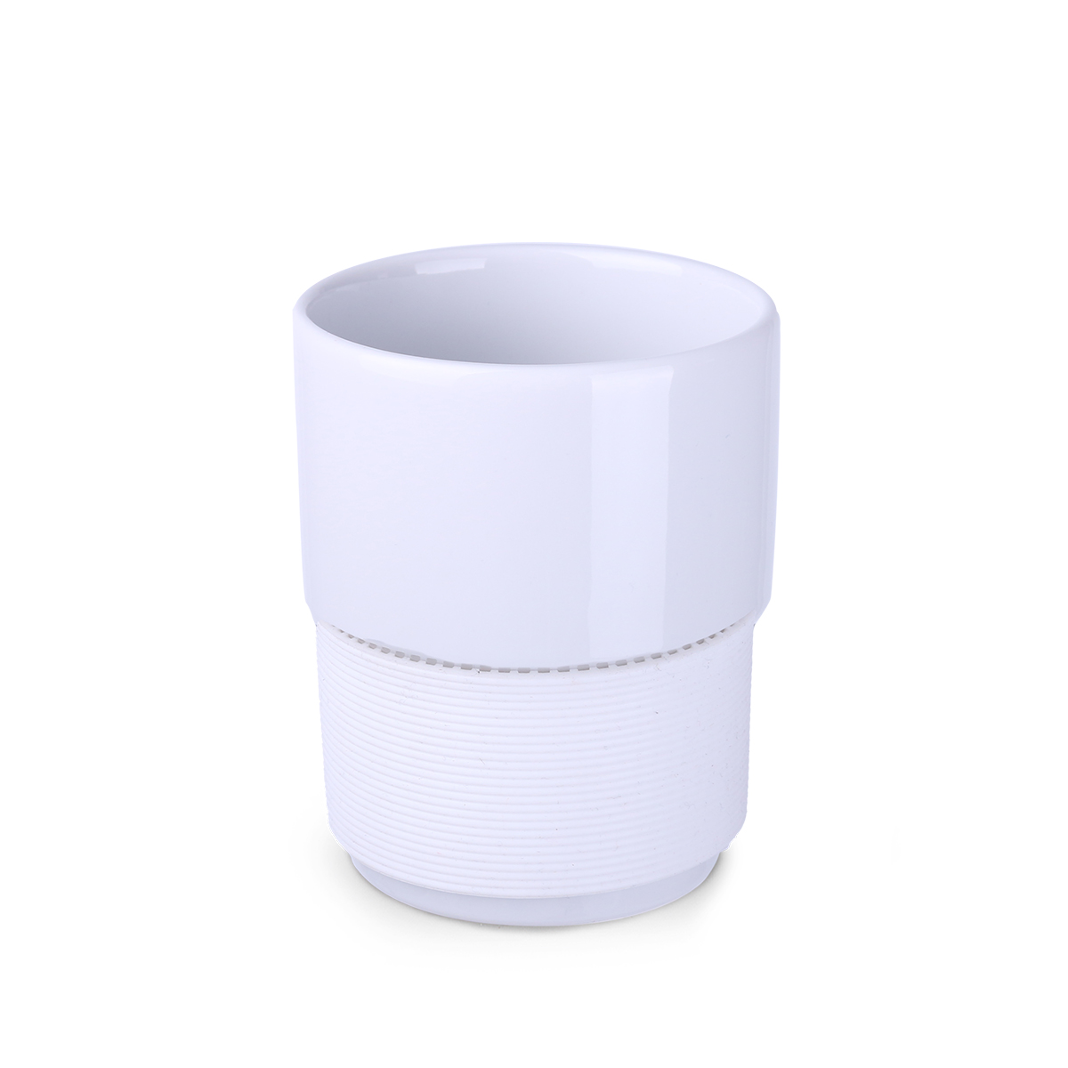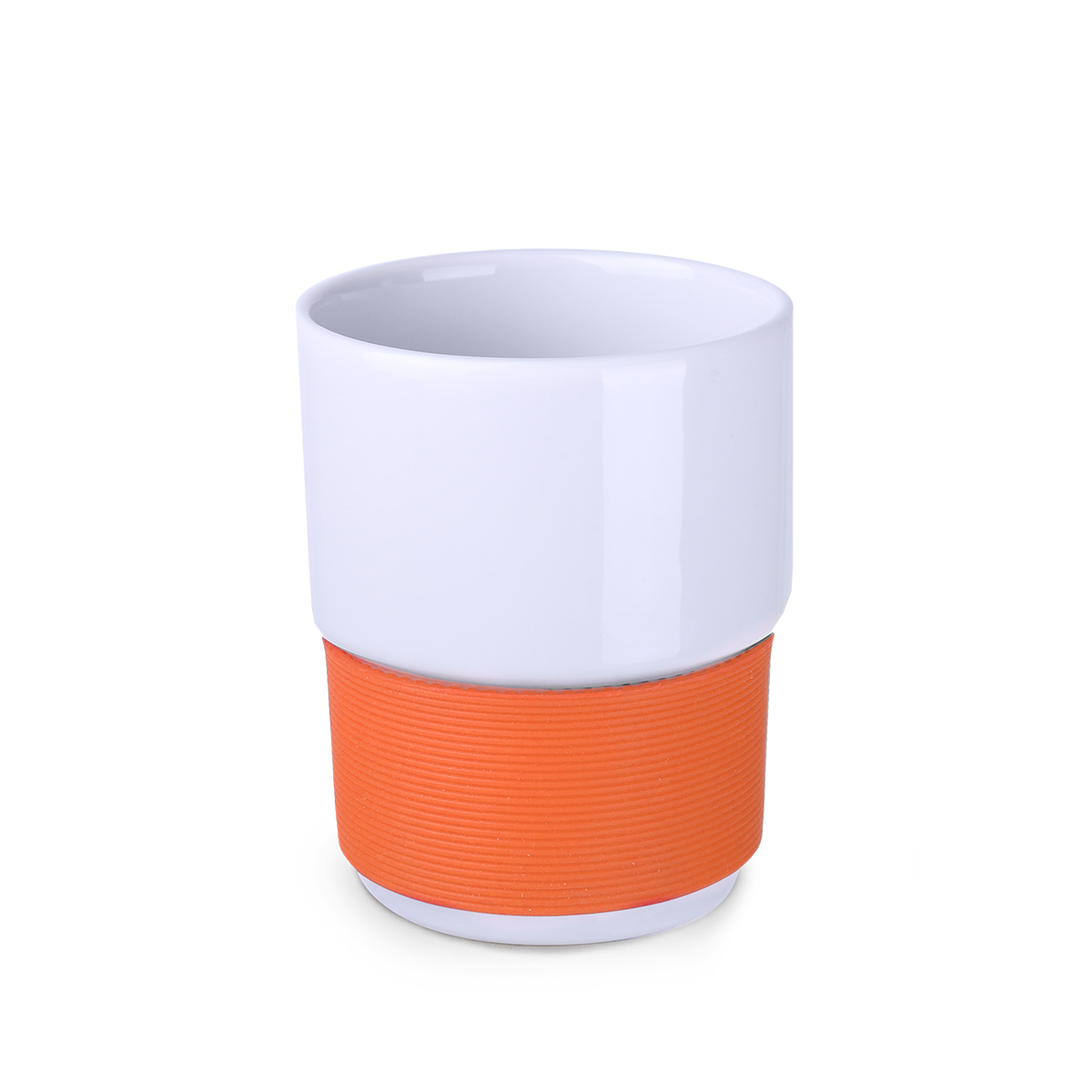 Medium size ceramic advertising mug without handle. The 40mm wide bands are available in 7 colors: white, orange, red, green, navy blue, brown and black.