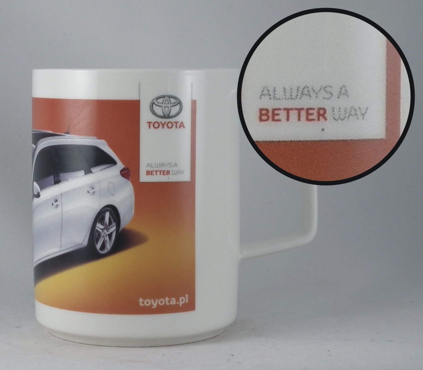 CMYK imprint (decorations made using 4 basic colors: cyan, magenta, yellow black) on promotional mugs is a type of imprint with a great potential. It doesn’t mean that it can be used in each and every case. This kind of imprint has a series of limitations which shall be well known of before placing an order. Often times, a much better solution might turn out to be applying another method (imprints of additional solid colors according Pantone Matching System) or using a completely different technique, like Art Print.